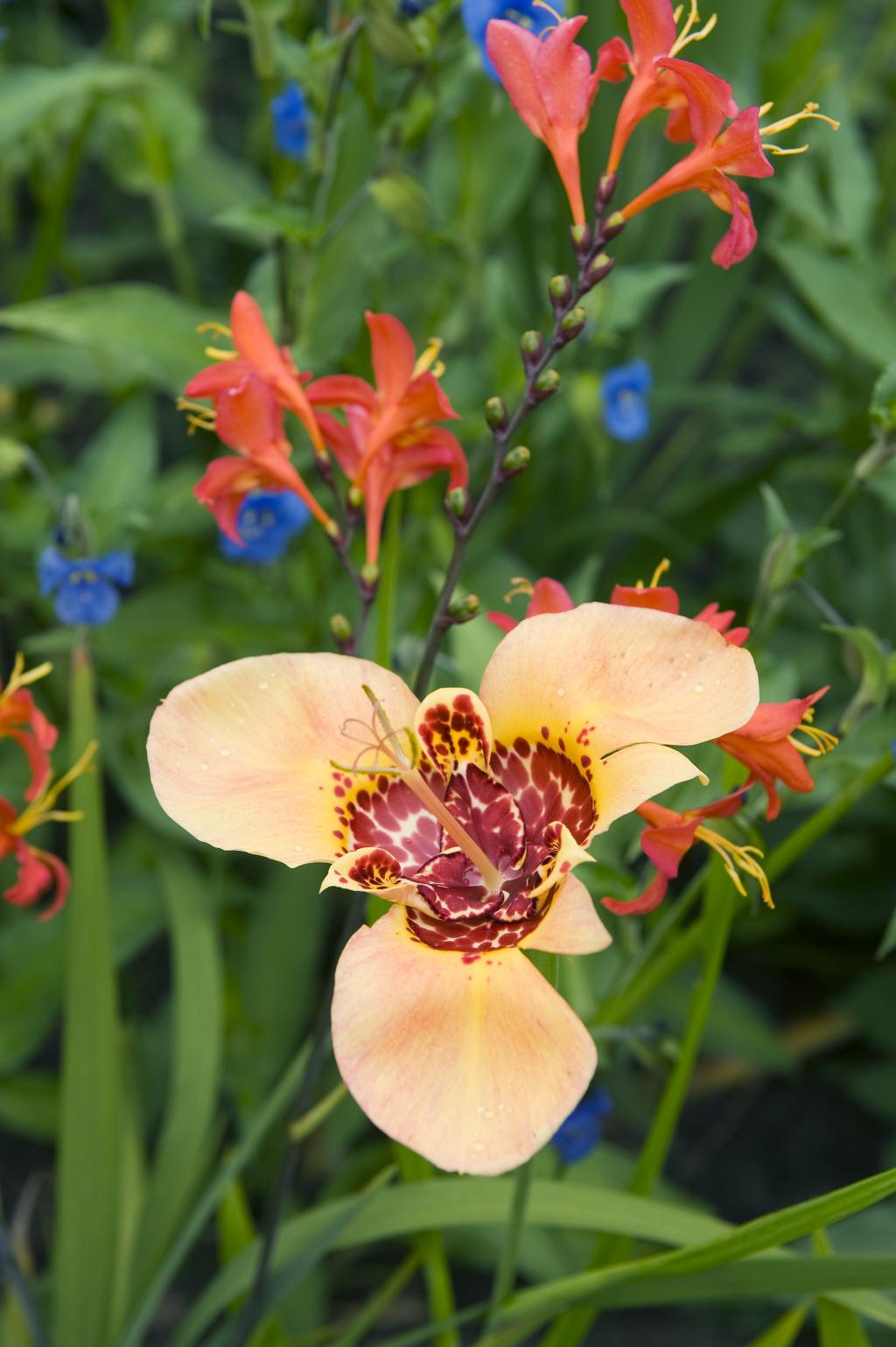 Клубнелуковицы неправильной формы, мякоть мучнистая. Листья тигридии похожи на листья гладиолуса, на цветоносе образуется несколько цветков, и цветение каждого отдельного цветка продолжается только один день. Свое название тигридия получила из-за сходства окраски цветка с пятнистой окраской шкуры тигра.